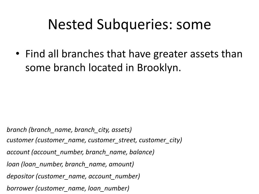 Nested Subqueries: some • Find all branches that have greater assets than some branch located in Brooklyn. branch (branch_name, branch_city, assets) customer (customer_name, customer_street, customer_city) account (account_number, branch_name, balance) loan (loan_number, branch_name, amount) depositor (customer_name, account_number) borrower(customer_name, loan_number)