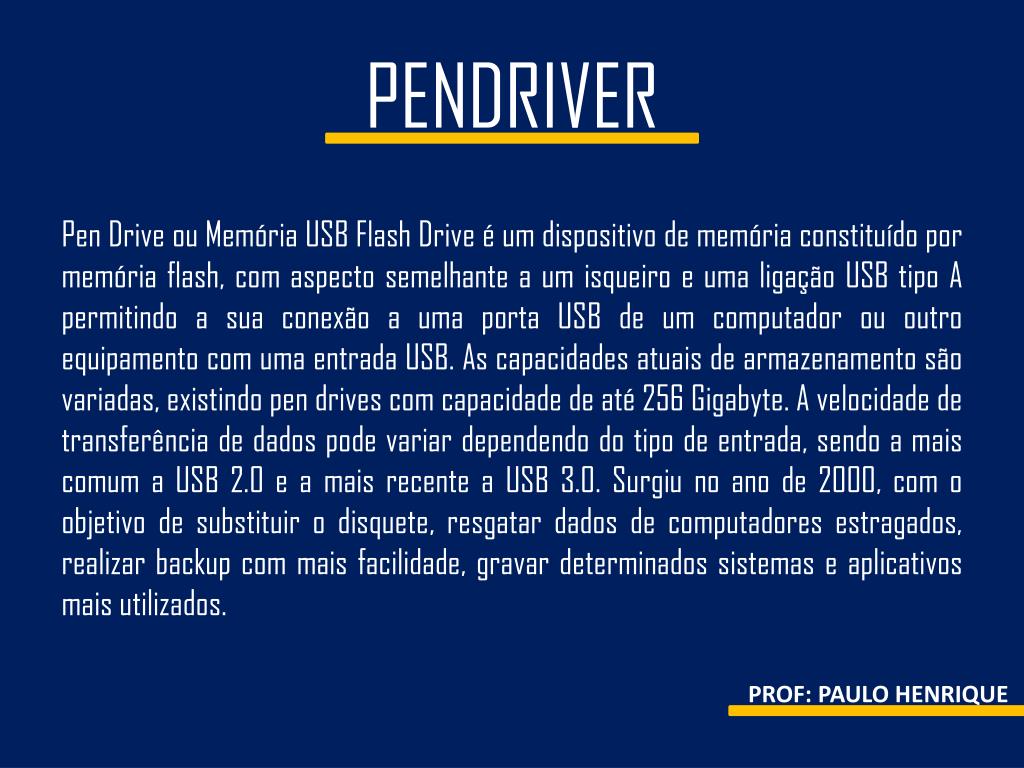 PENDRIVER Pen Drive ou Memória USB Flash Drive é um dispositivo de memória constituído por memória flash, com aspecto semelhante a um isqueiro e uma ligação USB tipo A permitindo a sua conexão a uma porta USB de um computador ou outro equipamento com uma entrada USB. As capacidades atuais de armazenamento são variadas, existindo pen drives com capacidade de até 256 Gigabyte. A velocidade de transferência de dados pode variar dependendo do tipo de entrada, sendo a mais comum a USB 2.0 e a mais recente a USB 3.0. Surgiu no ano de 2000, com o objetivo de substituir o disquete, resgatar dados de computadores estragados, realizar backup com mais facilidade, gravar determinados sistemas e aplicativos mais utilizados. PROF: PAULO HENRIQUE