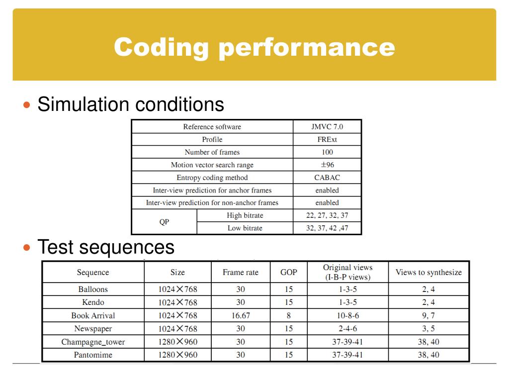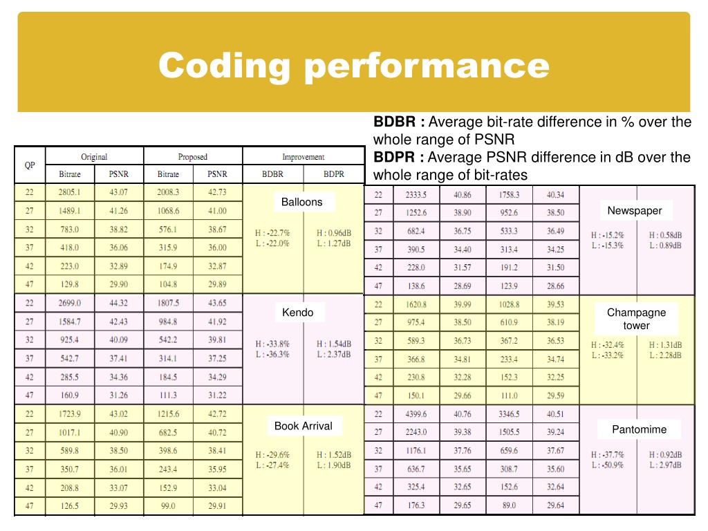 Coding performance BDBR : Average bit-rate difference in % over the whole range of PSNR BDPR :Average PSNR difference in dB over the whole range of bit-rates Balloons Newspaper Kendo Champagne tower Book Arrival Pantomime