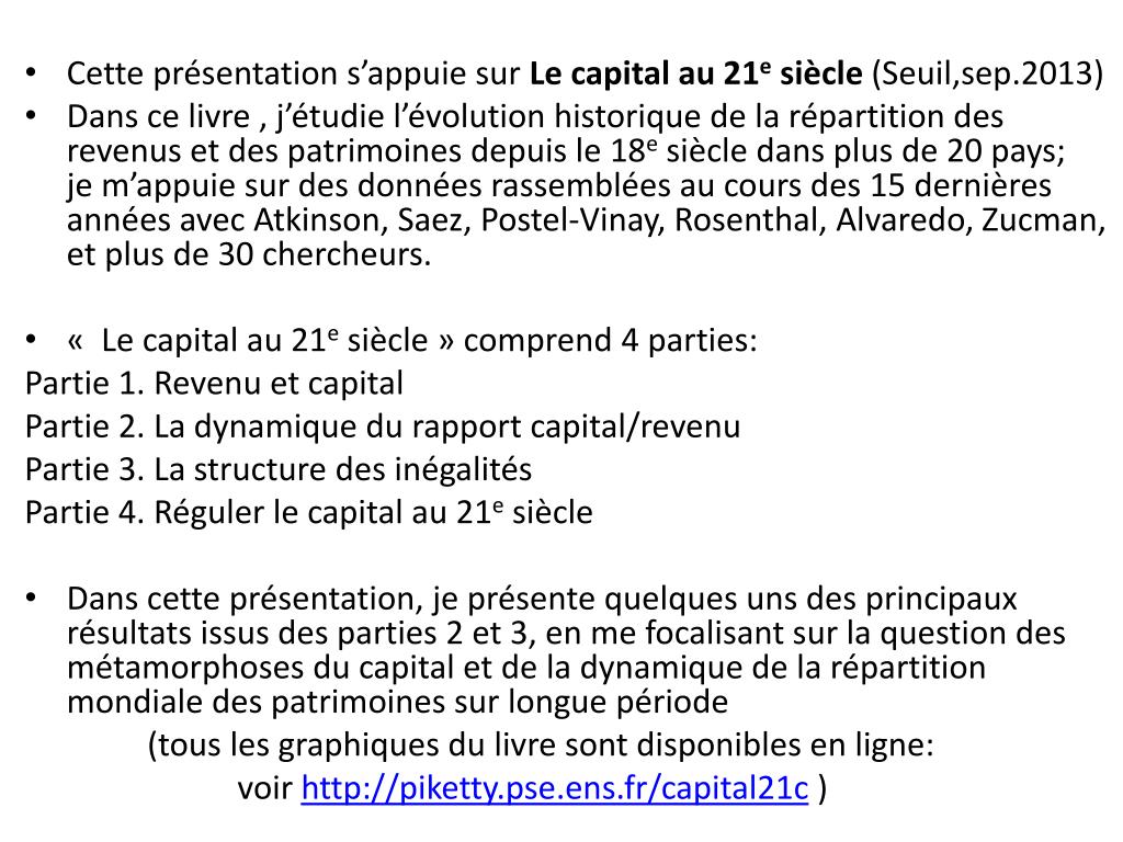 Cette présentation s’appuie sur Le capital au 21e siècle (Seuil,sep.2013) • Dans ce livre , j’étudie l’évolution historique de la répartition des revenus et des patrimoines depuis le 18e siècle dans plus de 20 pays; je m’appuie sur des données rassemblées au cours des 15 dernières années avec Atkinson, Saez, Postel-Vinay, Rosenthal, Alvaredo, Zucman, et plus de 30 chercheurs. • « Le capital au 21e siècle » comprend 4 parties: Partie 1. Revenu et capital Partie 2. La dynamique du rapport capital/revenu Partie 3. La structure des inégalités Partie 4. Réguler le capital au 21e siècle • Dans cette présentation, je présente quelques uns des principaux résultats issus des parties 2 et 3, en me focalisant sur la question des métamorphoses du capital et de la dynamique de la répartition mondiale des patrimoines sur longue période (tous les graphiques du livre sont disponibles en ligne: voir http://piketty.pse.ens.fr/capital21c )