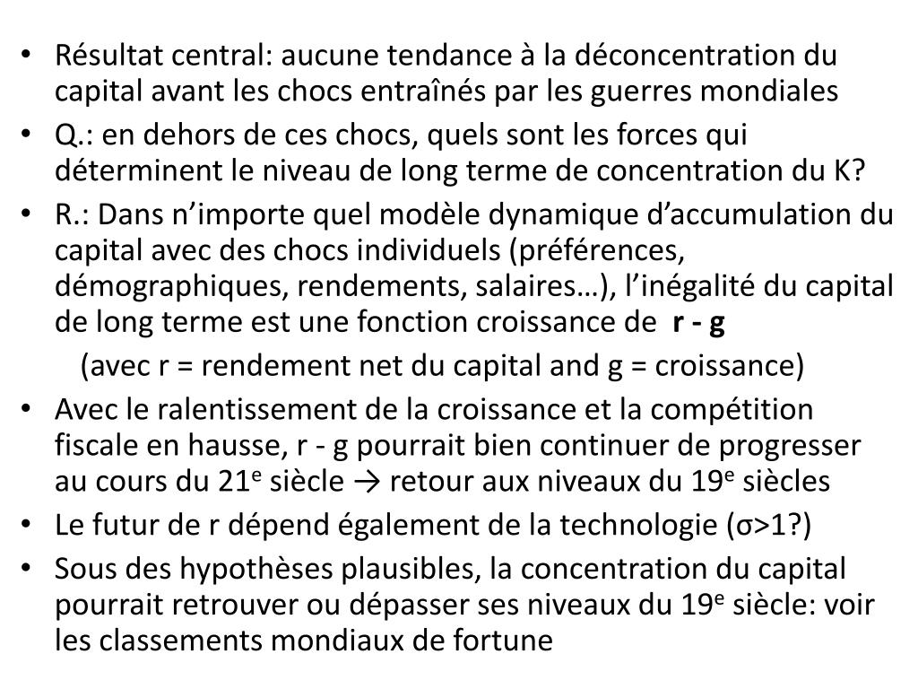 Résultat central: aucune tendance à la déconcentration du capital avant les chocs entraînés par les guerres mondiales • Q.: en dehors de ces chocs, quels sont les forces qui déterminent le niveau de long terme de concentration du K? • R.: Dans n’importe quel modèle dynamique d’accumulation du capital avec des chocs individuels (préférences, démographiques, rendements, salaires…), l’inégalité du capital de long terme est une fonction croissance de r - g (avec r = rendement net du capital and g = croissance) • Avec le ralentissement de la croissance et la compétition fiscale en hausse, r - g pourrait bien continuer de progresser au cours du 21e siècle → retour aux niveaux du 19e siècles • Le futur de r dépend également de la technologie (σ>1?) • Sous des hypothèses plausibles, la concentration du capital pourrait retrouver ou dépasser ses niveaux du 19e siècle: voir les classements mondiaux de fortune