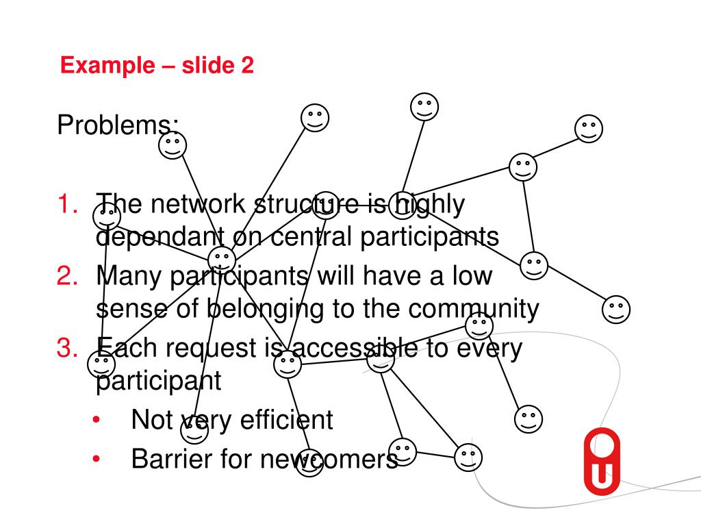 Example – slide 2 • Problems: • The network structure is highly dependant on central participants • Many participants will have a low sense of belonging to the community • Each request is accessible to every participant • Not very efficient • Barrier for newcomers