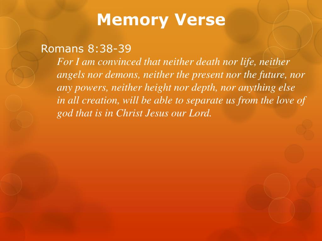 Memory Verse • Romans 8:38-39 • For I am convinced that neither death nor life, neither angels nor demons, neither the present nor the future, nor any powers, neither height nor depth, nor anything else in all creation, will be able to separate us from the love of god that is in Christ Jesus our Lord.