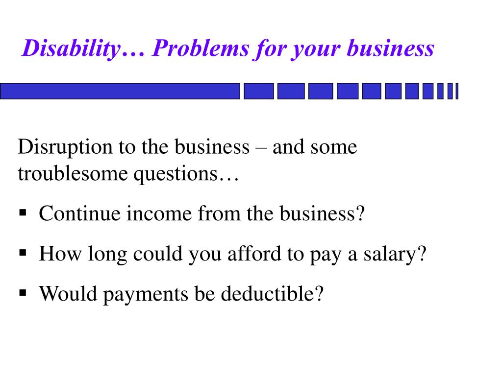 Disability… Problems for your business • Disruption to the business – and some troublesome questions… • Continue income from the business? • How long could you afford to pay a salary? • Would payments be deductible?
