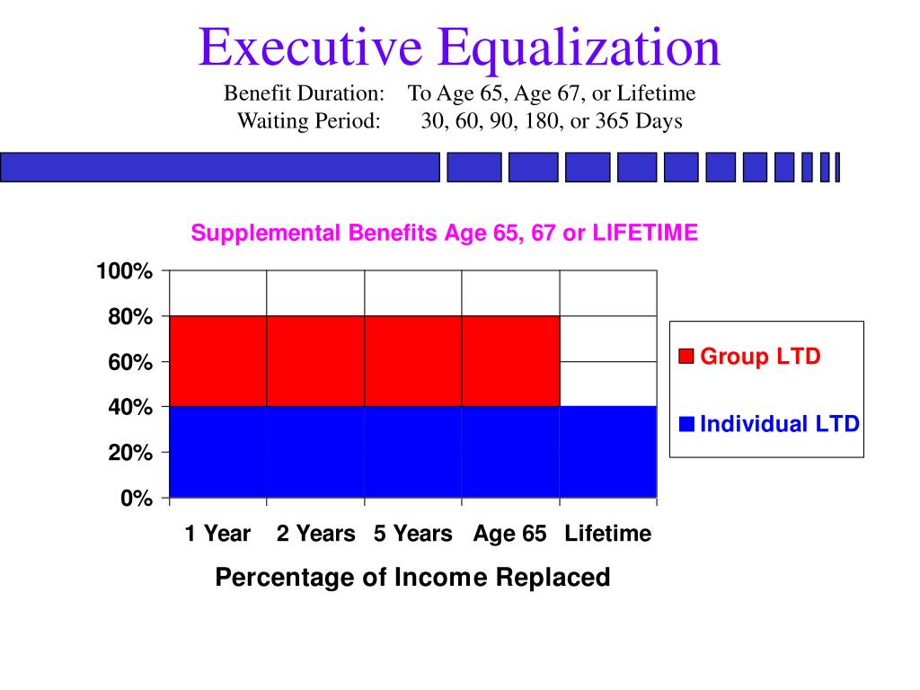 Executive EqualizationBenefit Duration: To Age 65, Age 67, or LifetimeWaiting Period: 30, 60, 90, 180, or 365 Days