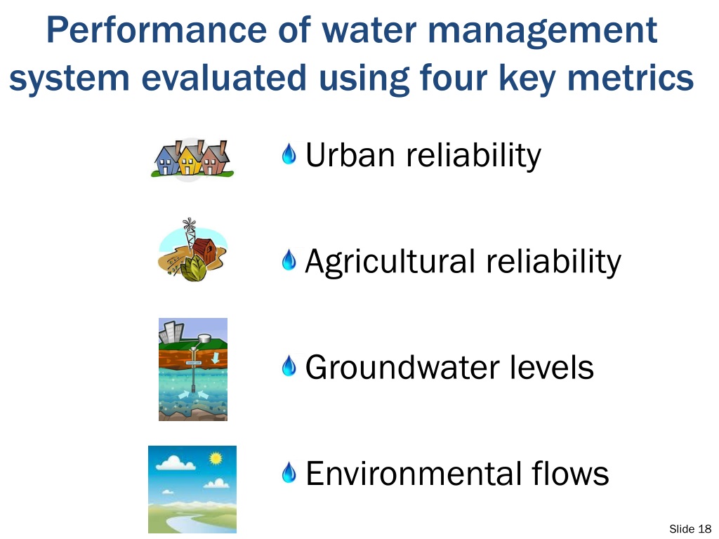 Performance of water management system evaluated using four key metrics • Urban reliability • Agricultural reliability • Groundwater levels • Environmental flows