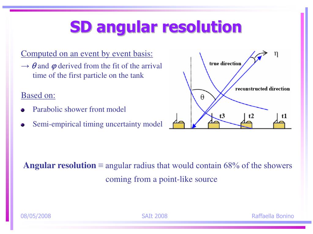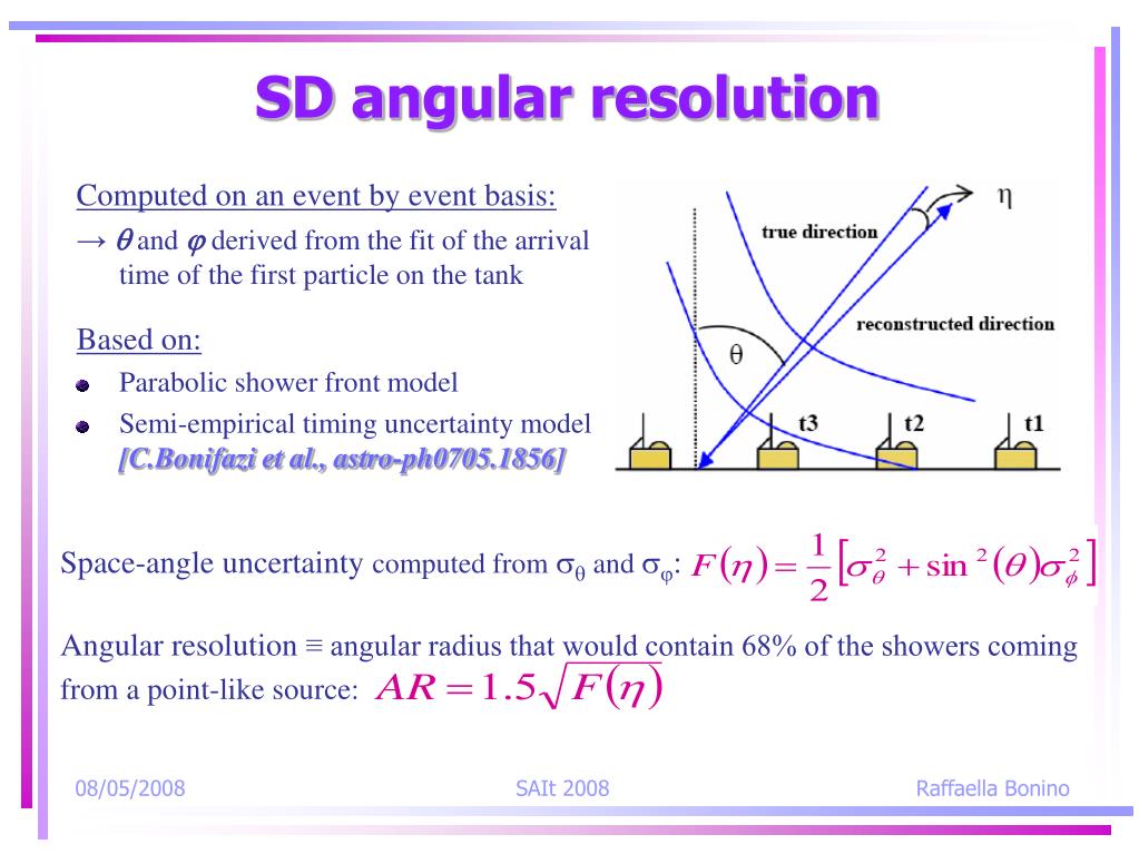 SD angular resolution Computed on an event by event basis: → and derived from the fit of the arrival time of the first particle on the tank Based on: • Parabolic shower front model • Semi-empirical timing uncertainty model Angular resolution≡ angular radius that would contain 68% of the showers coming from a point-like source SAIt 2008 Raffaella Bonino