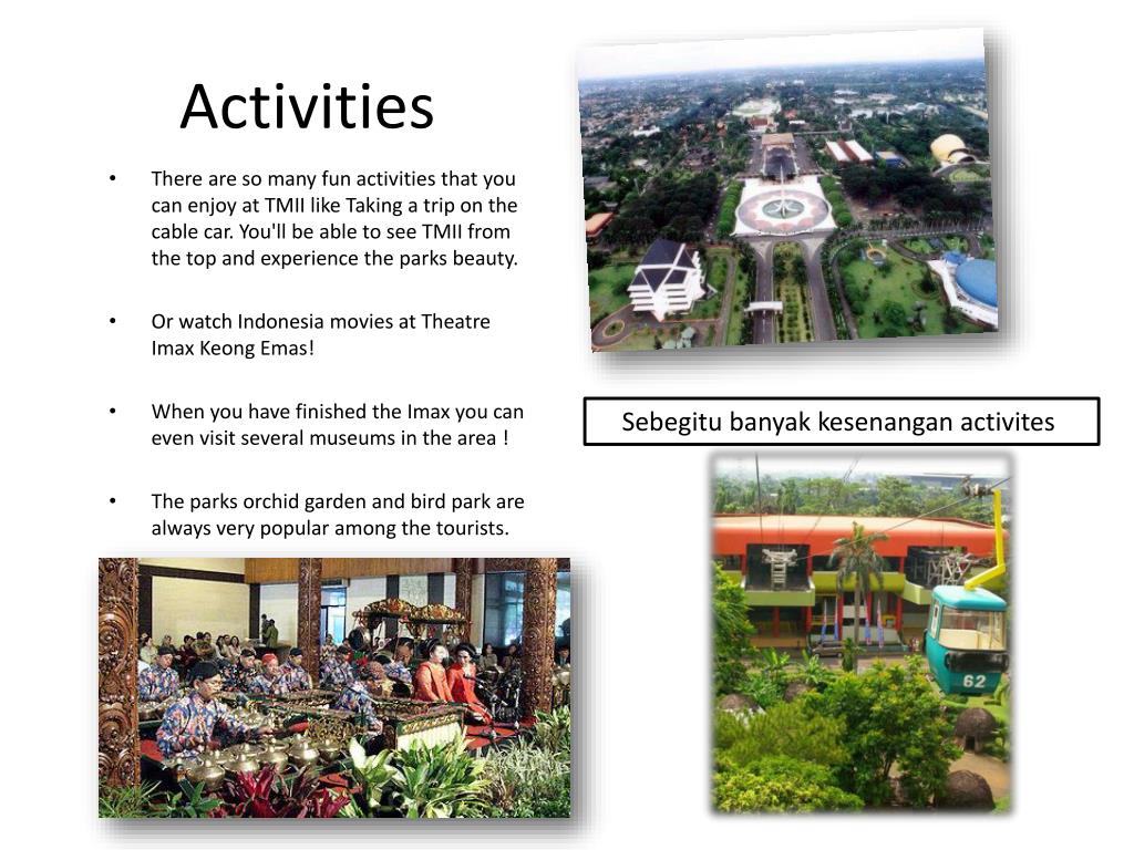 Activities • There are so many fun activities that you can enjoy at TMII like Taking a trip on the cable car. You'll be able to see TMII from the top and experience the parks beauty. • Or watch Indonesia movies at Theatre Imax KeongEmas! • When you have finished the Imax you can even visit several museums in the area ! • The parks orchid garden and bird park are always very popular among the tourists. Sebegitubanyakkesenanganactivites