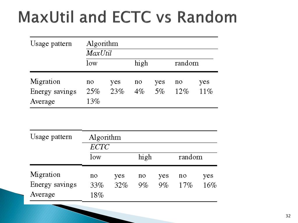 The Algorithms • Two algorithms presented, differ only in cost function • ECTC • Explicitly computes energy consumption • MaxUtil • Average utilization -during processing time of the task to schedule • Increase consolidation density