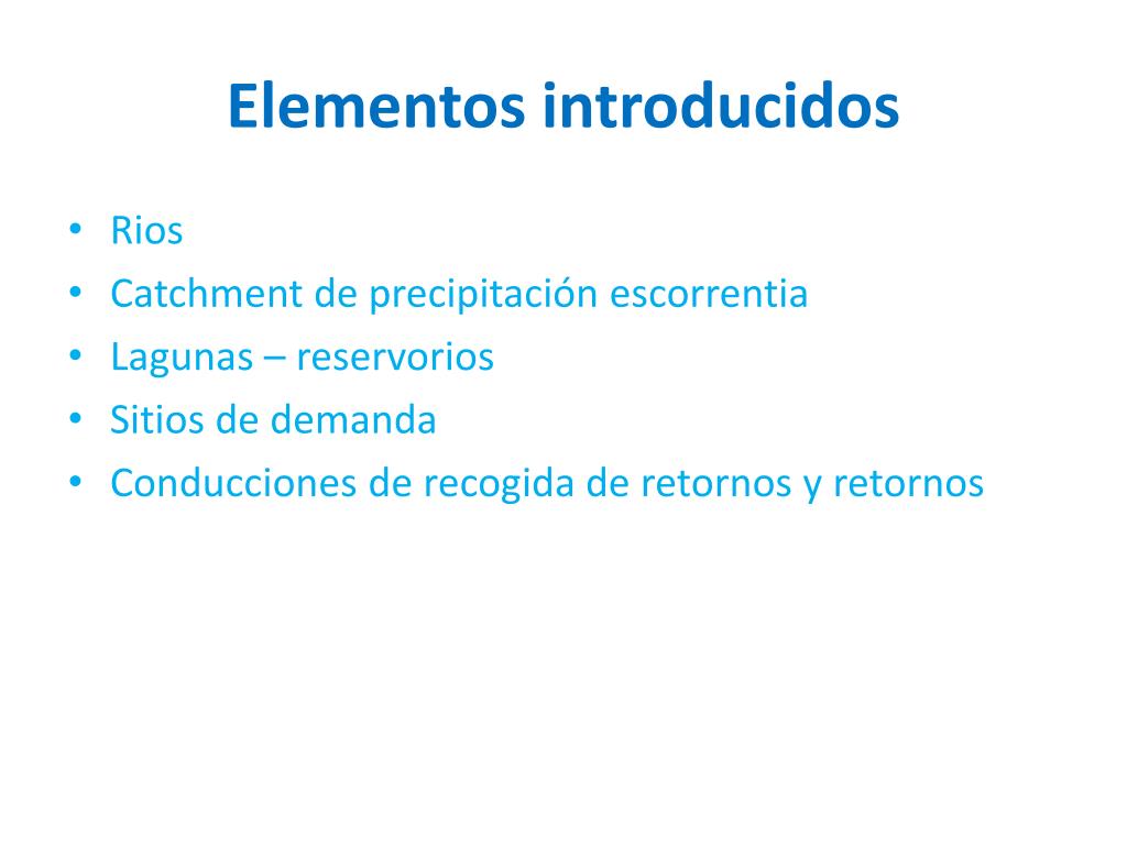 Elementos introducidos • Rios • Catchment de precipitación escorrentia • Lagunas – reservorios • Sitios de demanda • Conducciones de recogida de retornos y retornos