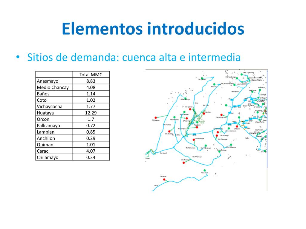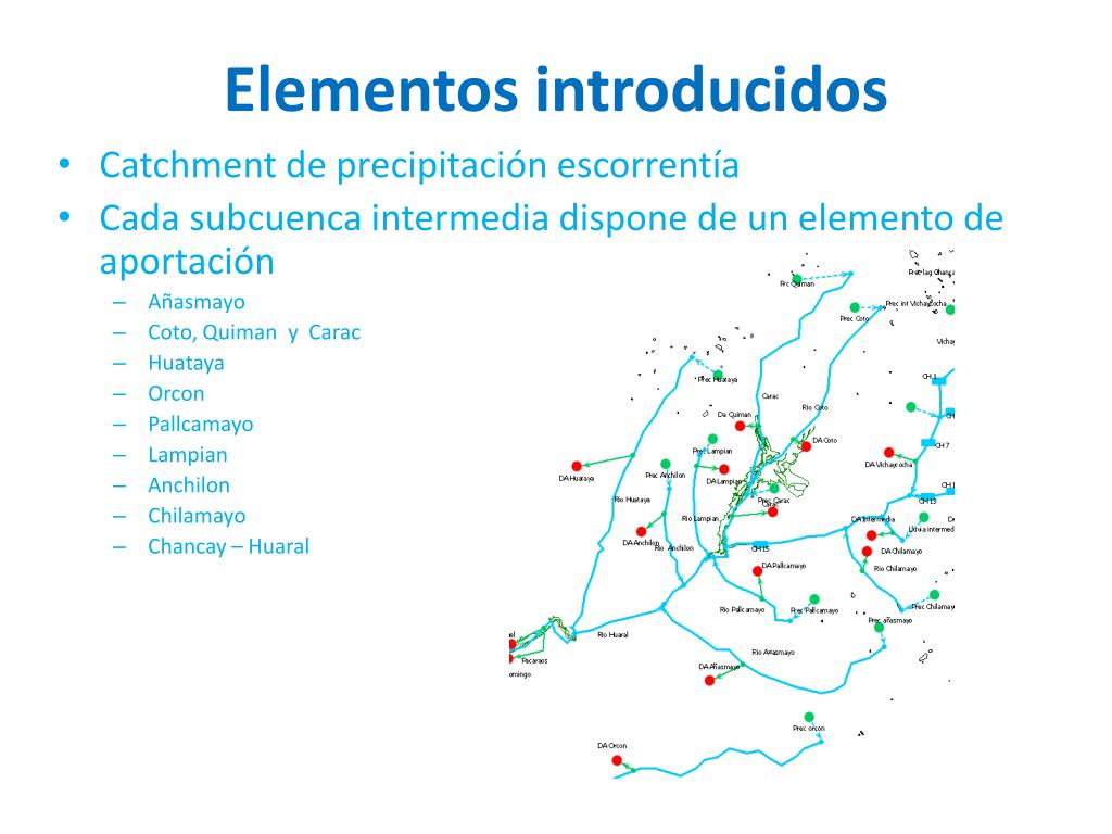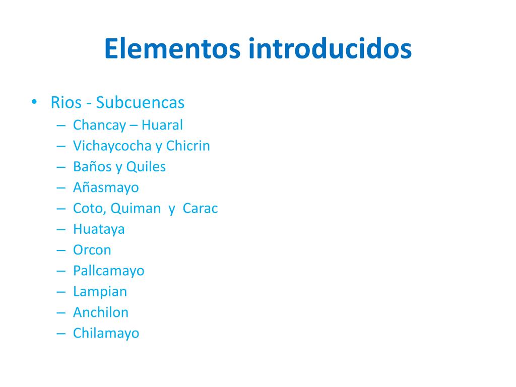 Elementos introducidos • Rios - Subcuencas • Chancay – Huaral • Vichaycocha y Chicrin • Baños y Quiles • Añasmayo • Coto, Quiman y Carac • Huataya • Orcon • Pallcamayo • Lampian • Anchilon • Chilamayo