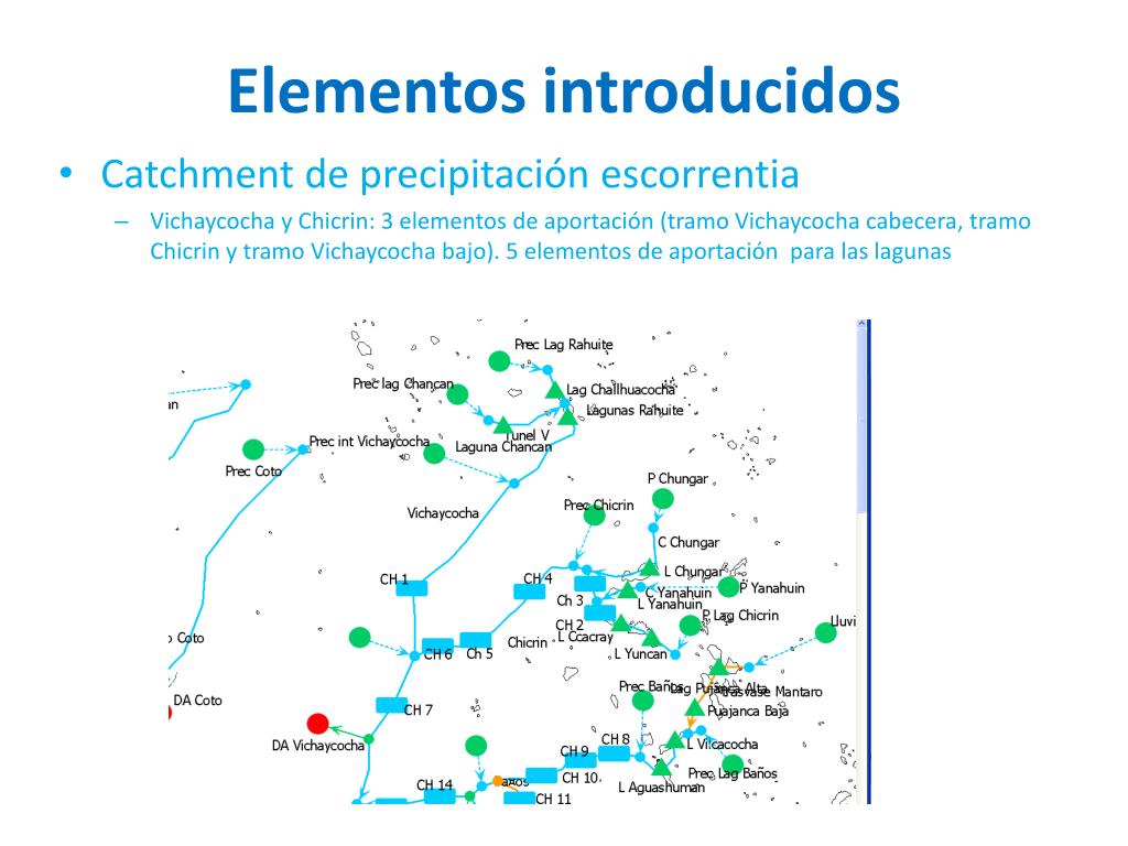 Elementos introducidos • Catchment de precipitación escorrentia • Vichaycocha y Chicrin: 3 elementos de aportación (tramo Vichaycocha cabecera, tramo Chicrin y tramo Vichaycocha bajo). 5 elementos de aportación para las lagunas