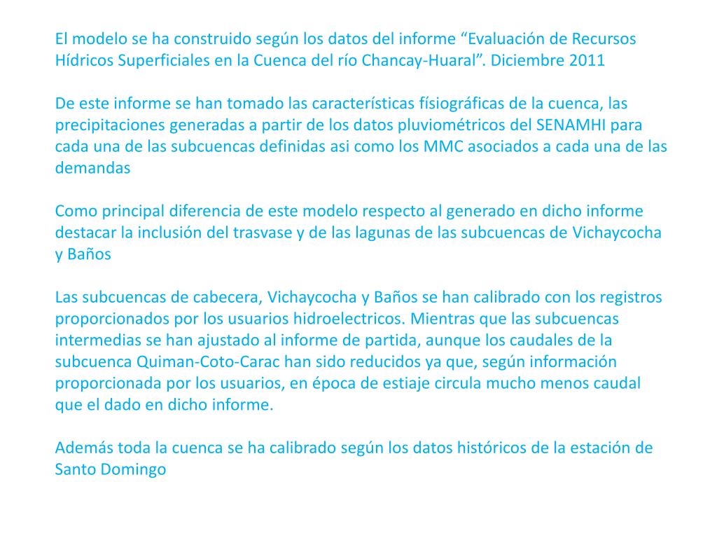 El modelo se ha construido según los datos del informe “Evaluación de Recursos Hídricos Superficiales en la Cuenca del río Chancay-Huaral”. Diciembre 2011 De este informe se han tomado las características físiográficas de la cuenca, las precipitaciones generadas a partir de los datos pluviométricos del SENAMHI para cada una de las subcuencas definidas asi como los MMC asociados a cada una de las demandas Como principal diferencia de este modelo respecto al generado en dicho informe destacar la inclusión del trasvase y de las lagunas de las subcuencas de Vichaycocha y Baños Las subcuencas de cabecera, Vichaycocha y Baños se han calibrado con los registros proporcionados por los usuarios hidroelectricos. Mientras que las subcuencas intermedias se han ajustado al informe de partida, aunque los caudales de la subcuencaQuiman-Coto-Carac han sido reducidos ya que, según información proporcionada por los usuarios, en época de estiaje circula mucho menos caudal que el dado en dicho informe. Además toda la cuenca se ha calibrado según los datos históricos de la estación de Santo Domingo