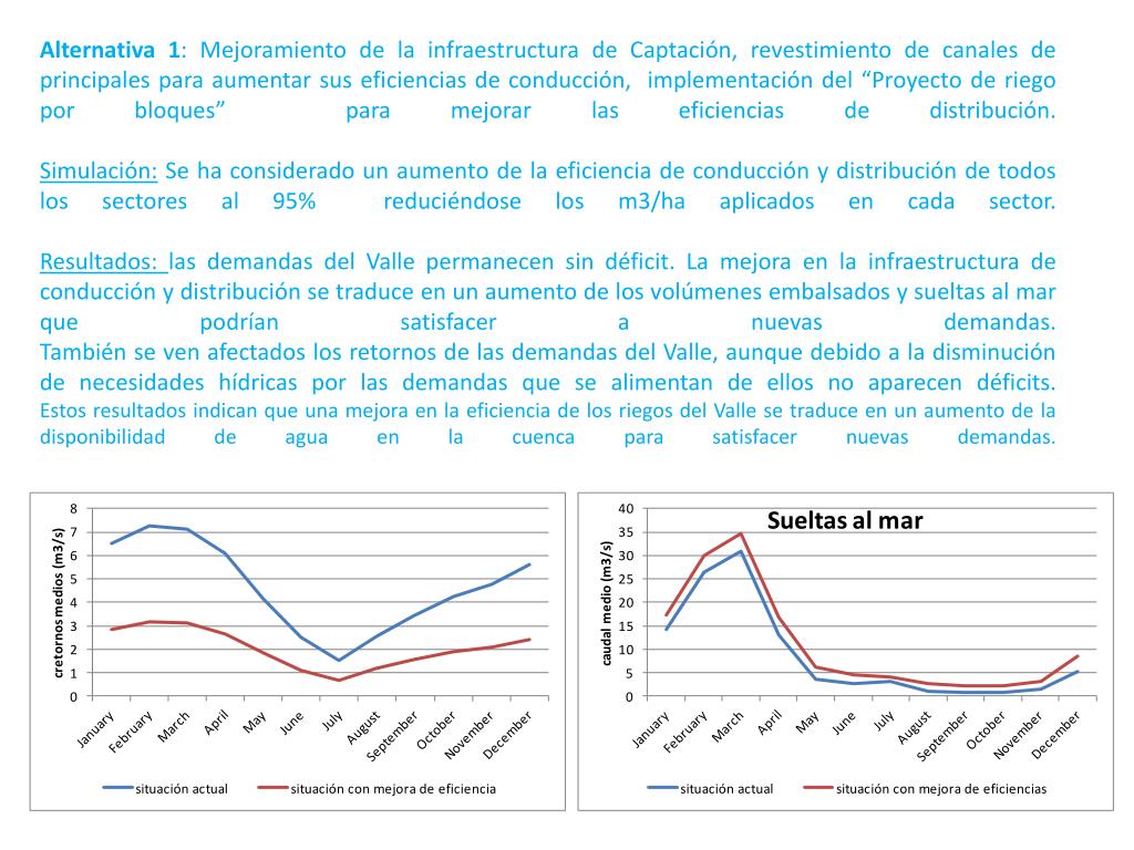Alternativa 1: Mejoramiento de la infraestructura de Captación, revestimiento de canales de principales para aumentar sus eficiencias de conducción, implementación del “Proyecto de riego por bloques” para mejorar las eficiencias de distribución.Simulación: Se ha considerado un aumento de la eficiencia de conducción y distribución de todos los sectores al 95% reduciéndose los m3/ha aplicados en cada sector.Resultados: las demandas del Valle permanecen sin déficit. La mejora en la infraestructura de conducción y distribución se traduce en un aumento de los volúmenes embalsados y sueltas al mar que podrían satisfacer a nuevas demandas. También se ven afectados los retornos de las demandas del Valle, aunque debido a la disminución de necesidades hídricas por las demandas que se alimentan de ellos no aparecen déficits.Estos resultados indican que una mejora en la eficiencia de los riegos del Valle se traduce en un aumento de la disponibilidad de agua en la cuenca para satisfacer nuevas demandas.
