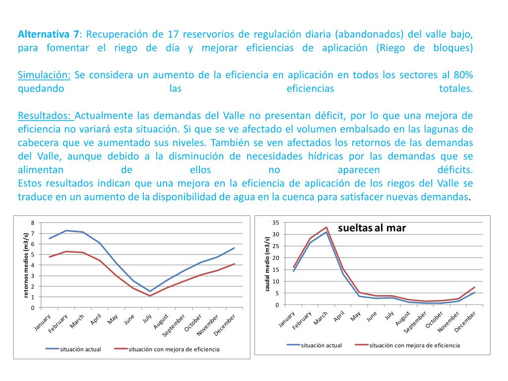 Alternativa 7: Recuperación de 17 reservorios de regulación diaria (abandonados) del valle bajo, para fomentar el riego de día y mejorar eficiencias de aplicación (Riego de bloques)Simulación:Se considera un aumento de la eficiencia en aplicación en todos los sectores al 80% quedando las eficiencias totales.Resultados: Actualmente las demandas del Valle no presentan déficit, por lo que una mejora de eficiencia no variará esta situación. Si que se ve afectado el volumen embalsado en las lagunas de cabecera que ve aumentado sus niveles. También se ven afectados los retornos de las demandas del Valle, aunque debido a la disminución de necesidades hídricas por las demandas que se alimentan de ellos no aparecen déficits.Estos resultados indican que una mejora en la eficiencia de aplicación de los riegos del Valle se traduce en un aumento de la disponibilidad de agua en la cuenca para satisfacer nuevas demandas.