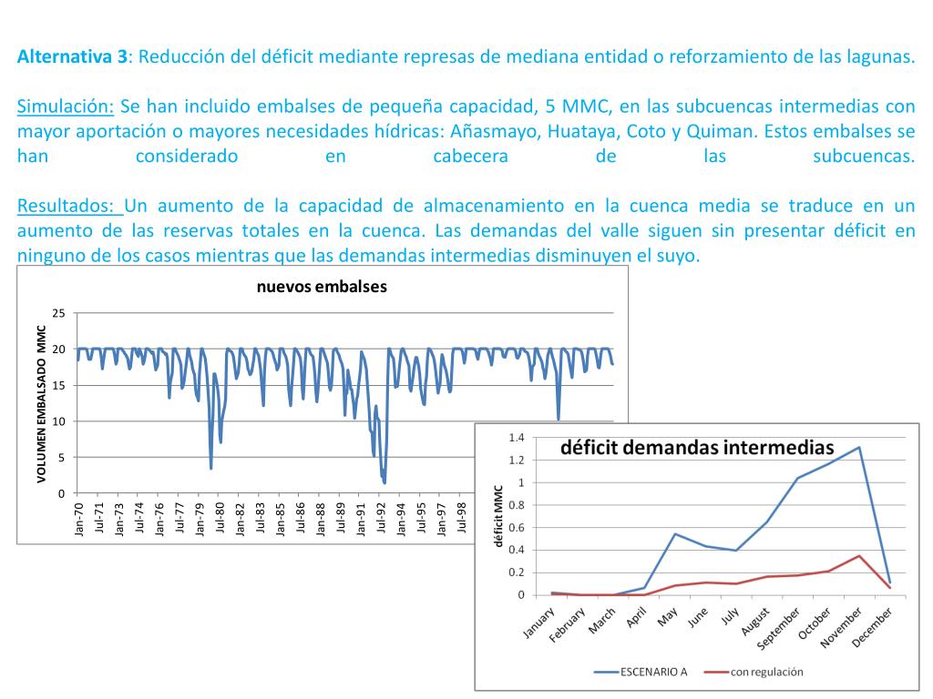 Alternativa 3: Reducción del déficit mediante represas de mediana entidad o reforzamiento de las lagunas.Simulación:Se han incluido embalses de pequeña capacidad, 5 MMC, en las subcuencas intermedias con mayor aportación o mayores necesidades hídricas: Añasmayo, Huataya, Coto y Quiman. Estos embalses se han considerado en cabecera de las subcuencas.Resultados: Un aumento de la capacidad de almacenamiento en la cuenca media se traduce en un aumento de las reservas totales en la cuenca. Las demandas del valle siguen sin presentar déficit en ninguno de los casos mientras que las demandas intermedias disminuyen el suyo.