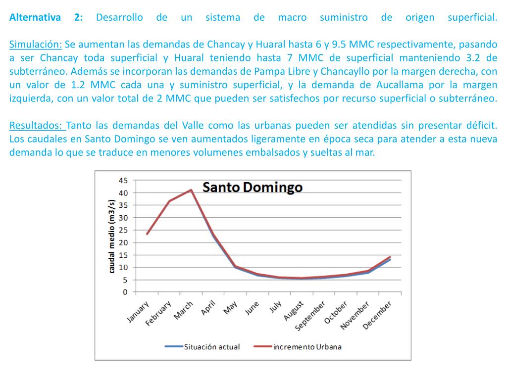 Alternativa 1: Mejora individual de las fuentes de abastecimiento de los centros poblados con aguas superficiales y subterráneasSimulación: Se aumentan las demandas de Chancay y Huaral hasta 6 y 9.5 MMC respectivamente, pasando a ser Chancay toda superficial y Huaral teniendo hasta 7 MMC de superficial manteniendo 3.2 de subterráneoResultados: Tanto las demandas del Valle como las urbanas pueden ser atendidas sin presentar déficit.Los caudales en Santo Domingo se ven aumentados ligeramente en época seca para atender a esta nueva demanda.