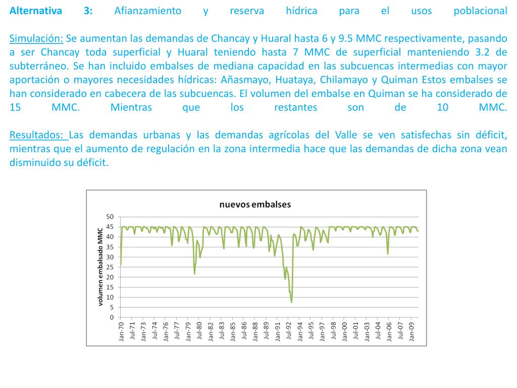 Alternativa 3: Afianzamiento y reserva hídrica para el usos poblacionalSimulación: Se aumentan las demandas de Chancay y Huaral hasta 6 y 9.5 MMC respectivamente, pasando a ser Chancay toda superficial y Huaral teniendo hasta 7 MMC de superficial manteniendo 3.2 de subterráneo. Se han incluido embalses de mediana capacidad en las subcuencas intermedias con mayor aportación o mayores necesidades hídricas: Añasmayo, Huataya, Chilamayo y Quiman Estos embalses se han considerado en cabecera de las subcuencas. El volumen del embalse en Quiman se ha considerado de 15 MMC. Mientras que los restantes son de 10 MMC. Resultados: Las demandas urbanas y las demandas agrícolas del Valle se ven satisfechas sin déficit, mientras que el aumento de regulación en la zona intermedia hace que las demandas de dicha zona vean disminuido su déficit.