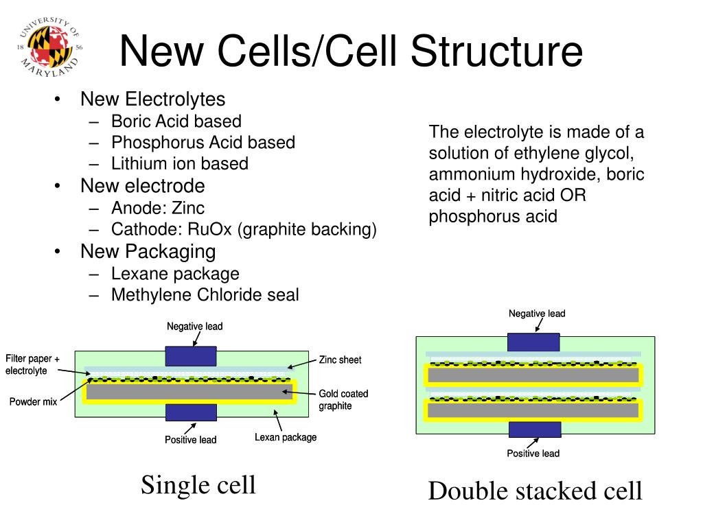 New Cells/Cell Structure The electrolyte is made of a solution of ethylene glycol, ammonium hydroxide, boric acid + nitric acid OR phosphorus acid • New Electrolytes • Boric Acid based • Phosphorus Acid based • Lithium ion based • New electrode • Anode: Zinc • Cathode: RuOx (graphite backing) • New Packaging • Lexane package • Methylene Chloride seal Single cell Double stacked cell