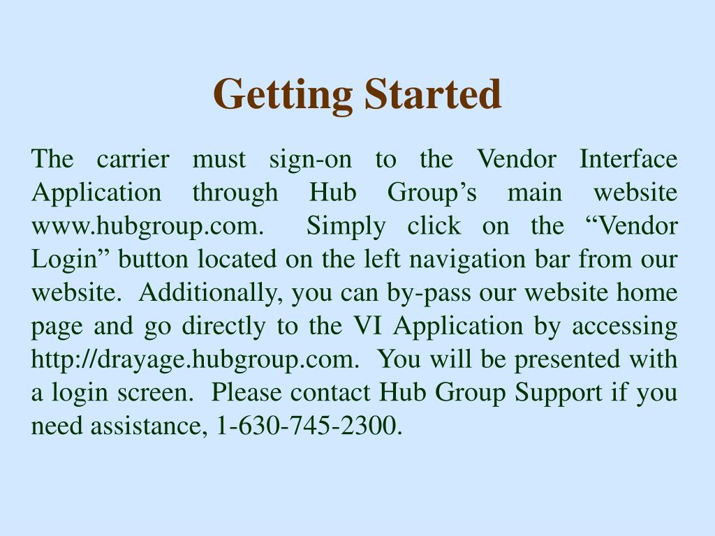 Getting Started The carrier must sign-on to the Vendor Interface Application through Hub Group’s main website www.hubgroup.com. Simply click on the “Vendor Login” button located on the left navigation bar from our website. Additionally, you can by-pass our website home page and go directly to the VI Application by accessing http://drayage.hubgroup.com. You will be presented with a login screen. Please contact Hub Group Support if you need assistance, 1-630-745-2300.