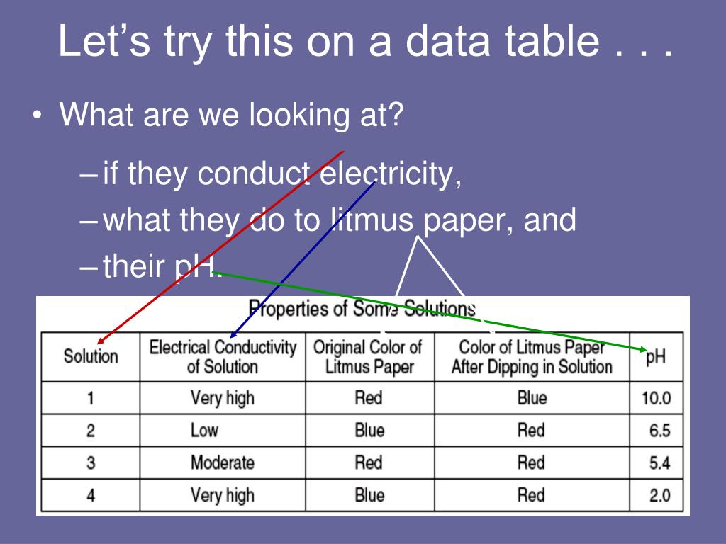 Let’s try this on a data table . . . • What are we looking at? • We are looking at 4 solutions • if they conduct electricity, • what they do to litmus paper, and • their pH.