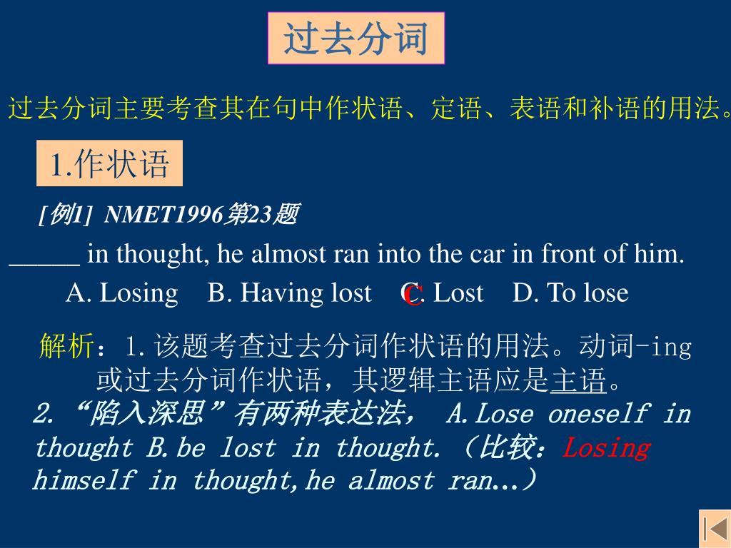 [例1] NMET1996第23题 _____ in thought, he almost ran into the car in front of him. A. Losing B. Having lost C. Lost D. To lose 过去分词 过去分词主要考查其在句中作状语、定语、表语和补语的用法。 1.作状语 C 解析:1.该题考查过去分词作状语的用法。动词-ing或过去分词作状语,其逻辑主语应是主语。 2.“陷入深思”有两种表达法, A.Lose oneself in thought B.be lost in thought.(比较:Losing himself in thought,he almost ran…)