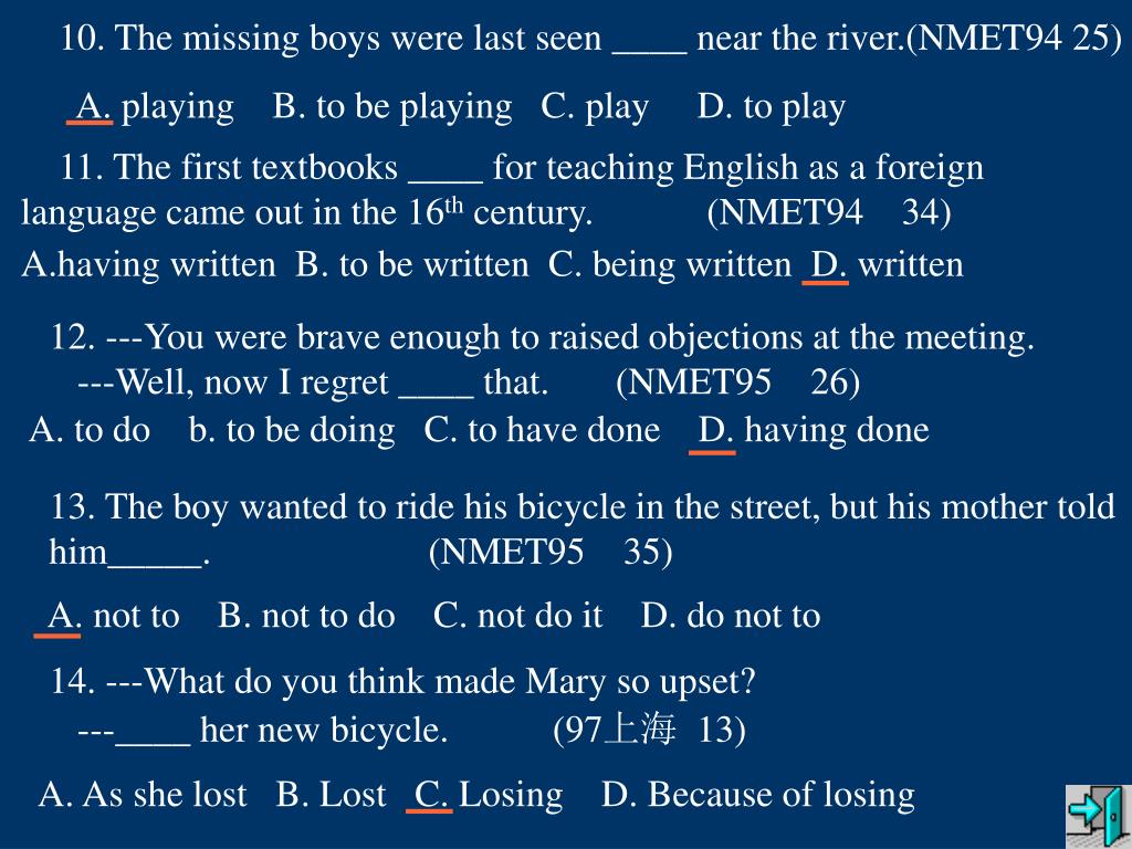 10. The missing boys were last seen ____ near the river.(NMET94 25) A. playing B. to be playing C. play D. to play 11. The first textbooks ____ for teaching English as a foreign language came out in the 16th century. (NMET94 34) A.having written B. to be written C. being written D. written 12. ---You were brave enough to raised objections at the meeting. ---Well, now I regret ____ that. (NMET95 26) A. to do b. to be doing C. to have done D. having done 13. The boy wanted to ride his bicycle in the street, but his mother told him_____. (NMET95 35) A. not to B. not to do C. not do it D. do not to 14. ---What do you think made Mary so upset? ---____ her new bicycle. (97上海 13) A. As she lost B. Lost C. Losing D. Because of losing