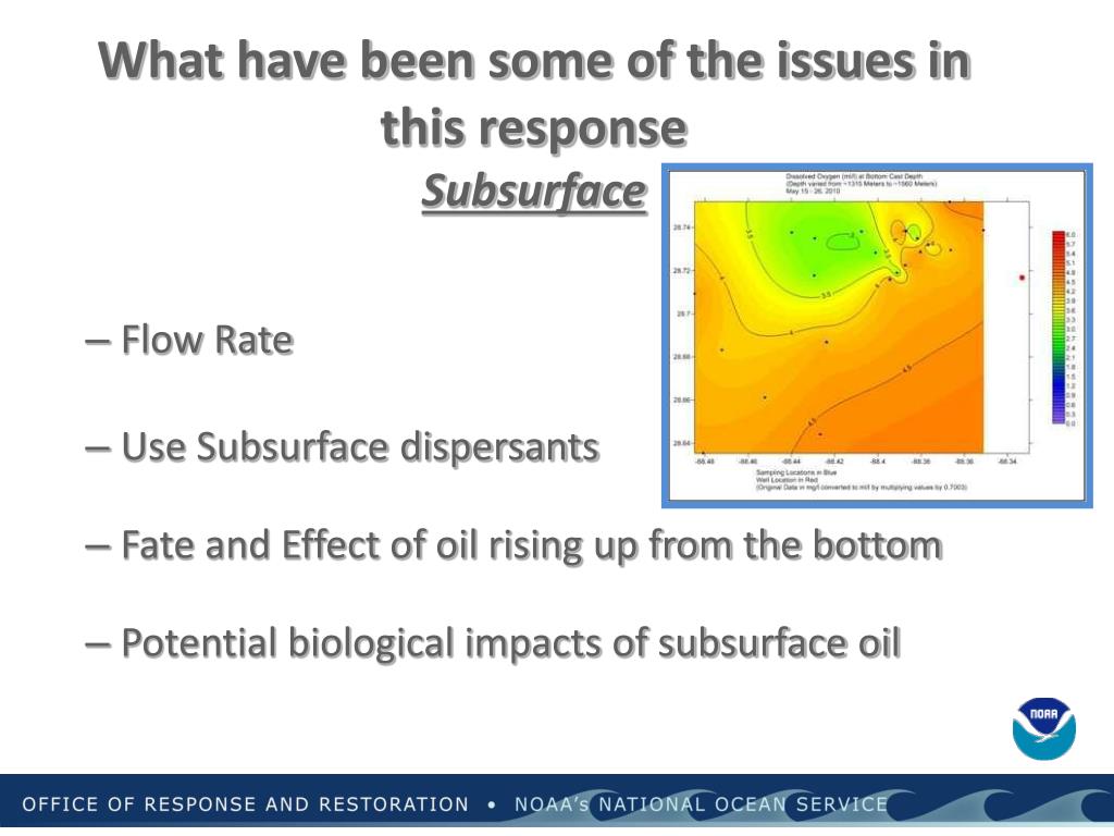 What have been some of the issues in this response Subsurface • Flow Rate • Use Subsurface dispersants • Fate and Effect of oil rising up from the bottom • Potential biological impacts of subsurface oil