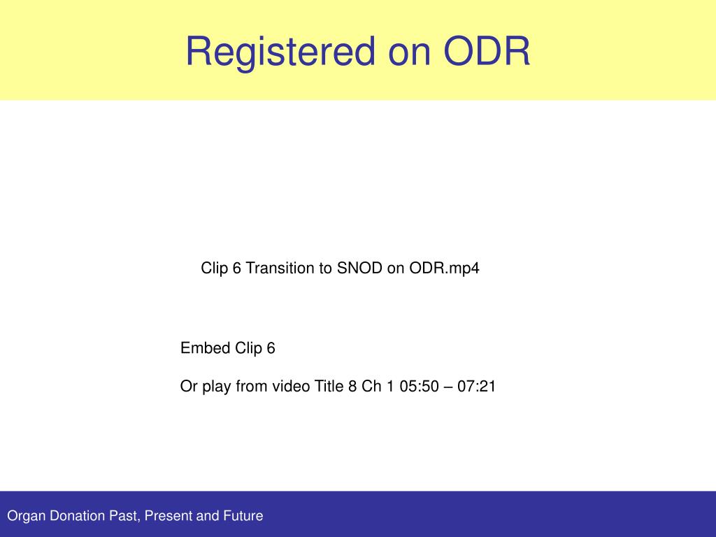 Registered on ODR Clip 6 Transition to SNOD on ODR.mp4 Embed Clip 6 Or play from video Title 8 Ch 1 05:50 – 07:21 Organ Donation Past, Present and Future