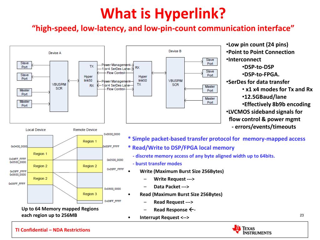 What is Hyperlink?“high-speed, low-latency, and low-pin-count communication interface” • Low pin count (24 pins) • Point to Point Connection • Interconnect • DSP-to-DSP • DSP-to-FPGA. • SerDes for data transfer • x1 x4 modes for Tx and Rx • 12.5GBaud/lane • Effectively 8b9b encoding • LVCMOS sideband signals for flow control & power mgmt - errors/events/timeouts * Simple packet-based transfer protocol for memory-mapped access * Read/Write to DSP/FPGA local memory - discrete memory access of any byte aligned width up to 64bits. - burst transfer modes • Write (Maximum Burst Size 256Bytes) • Write Request ---> • Data Packet ---> • Read (Maximum Burst Size 256Bytes) • Read Request ---> • Read Response - • Interrupt Request <--> Up to 64 Memory mapped Regionseach region up to 256MB