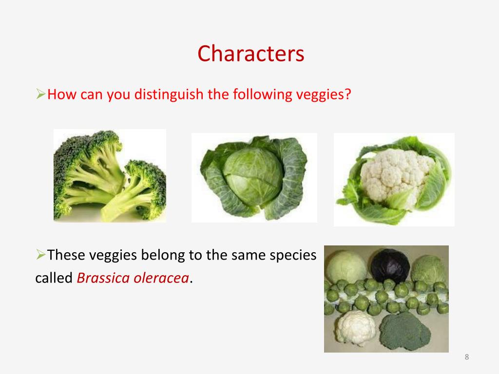 How can you distinguish the following veggies? • These veggies belong to the same species • called Brassica oleracea. Characters