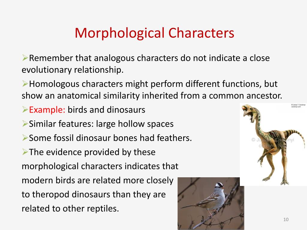 Remember that analogous characters do not indicate a close evolutionary relationship. • Homologous characters might perform different functions, but show an anatomical similarity inherited from a common ancestor. • Example: birds and dinosaurs • Similar features: large hollow spaces • Some fossil dinosaur bones had feathers. • The evidence provided by these • morphological characters indicates that • modern birds are related more closely • to theropod dinosaurs than they are • related to other reptiles. Morphological Characters