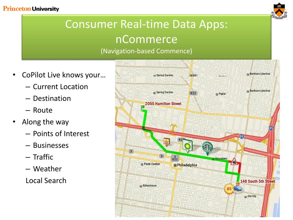 Consumer Real-time Data Apps: nCommerce (Navigation-based Commence) • CoPilot Live knows your… • Current Location • Destination • Route • Along the way • Points of Interest • Businesses • Traffic • Weather Local Search