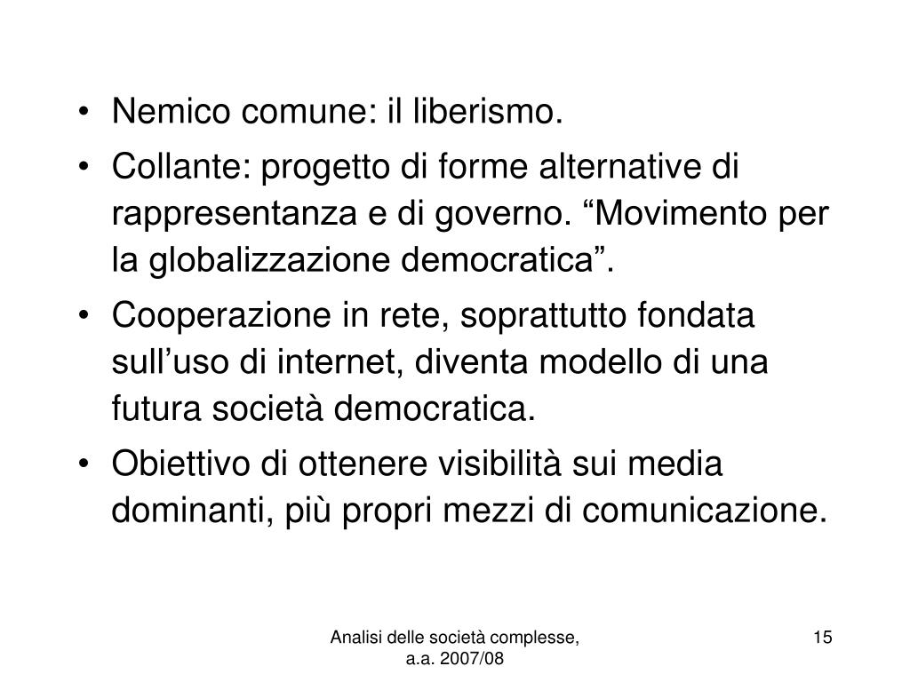 Nemico comune: il liberismo. • Collante: progetto di forme alternative di rappresentanza e di governo. “Movimento per la globalizzazione democratica”. • Cooperazione in rete, soprattutto fondata sull’uso di internet, diventa modello di una futura società democratica. • Obiettivo di ottenere visibilità sui media dominanti, più propri mezzi di comunicazione. Analisi delle società complesse, a.a. 2007/08