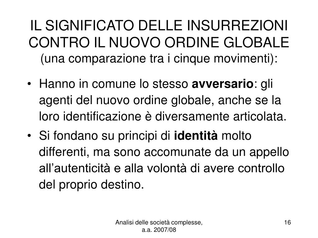 IL SIGNIFICATO DELLE INSURREZIONI CONTRO IL NUOVO ORDINE GLOBALE (una comparazione tra i cinque movimenti): • Hanno in comune lo stesso avversario: gli agenti del nuovo ordine globale, anche se la loro identificazione è diversamente articolata. • Si fondano su principi di identità molto differenti, ma sono accomunate da un appello all’autenticità e alla volontà di avere controllo del proprio destino. Analisi delle società complesse, a.a. 2007/08