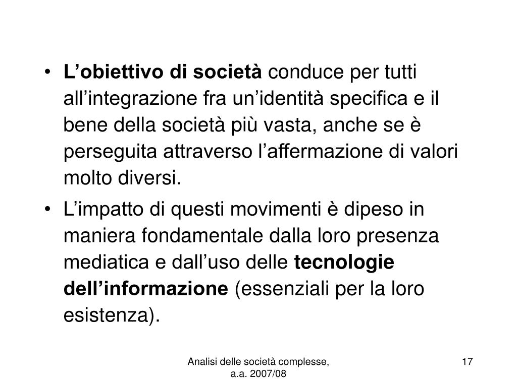L’obiettivo di società conduce per tutti all’integrazione fra un’identità specifica e il bene della società più vasta, anche se è perseguita attraverso l’affermazione di valori molto diversi. • L’impatto di questi movimenti è dipeso in maniera fondamentale dalla loro presenza mediatica e dall’uso delle tecnologie dell’informazione (essenziali per la loro esistenza). Analisi delle società complesse, a.a. 2007/08