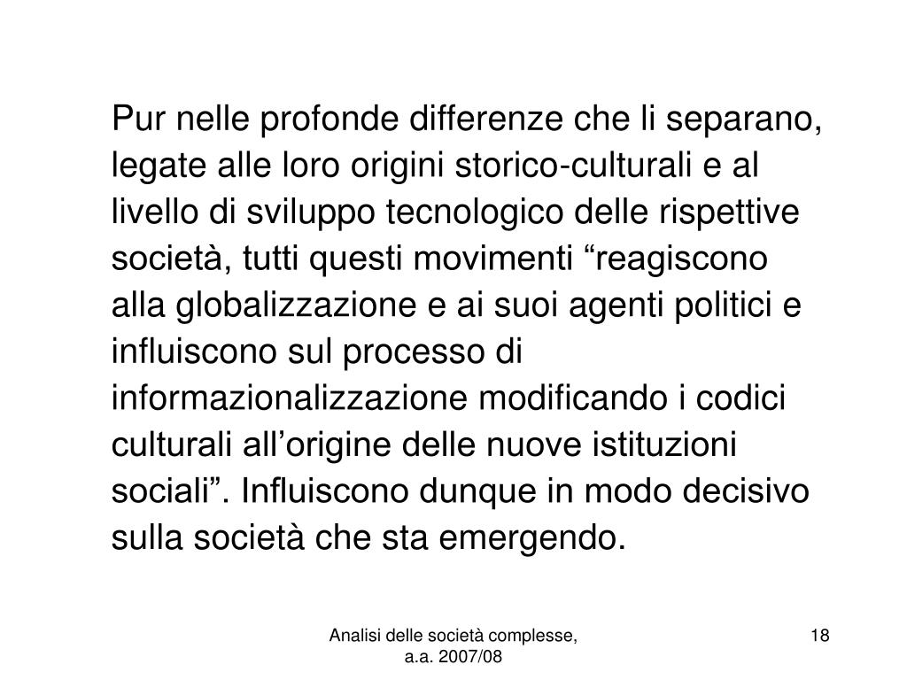 Pur nelle profonde differenze che li separano, legate alle loro origini storico-culturali e al livello di sviluppo tecnologico delle rispettive società, tutti questi movimenti “reagiscono alla globalizzazione e ai suoi agenti politici e influiscono sul processo di informazionalizzazione modificando i codici culturali all’origine delle nuove istituzioni sociali”. Influiscono dunque in modo decisivo sulla società che sta emergendo. Analisi delle società complesse, a.a. 2007/08