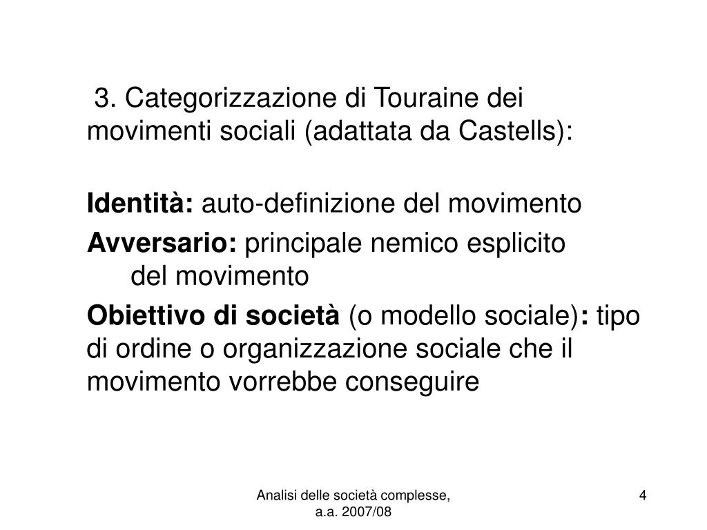 3. Categorizzazione di Touraine dei movimenti sociali (adattata da Castells): Identità: auto-definizione del movimento Avversario: principale nemico esplicito del movimento Obiettivo di società (o modello sociale): tipo di ordine o organizzazione sociale che il movimento vorrebbe conseguire Analisi delle società complesse, a.a. 2007/08