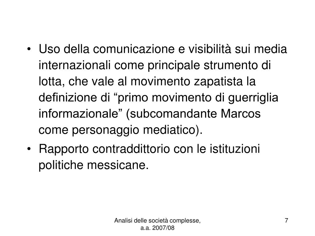 Uso della comunicazione e visibilità sui media internazionali come principale strumento di lotta, che vale al movimento zapatista la definizione di “primo movimento di guerriglia informazionale” (subcomandante Marcos come personaggio mediatico). • Rapporto contraddittorio con le istituzioni politiche messicane. Analisi delle società complesse, a.a. 2007/08