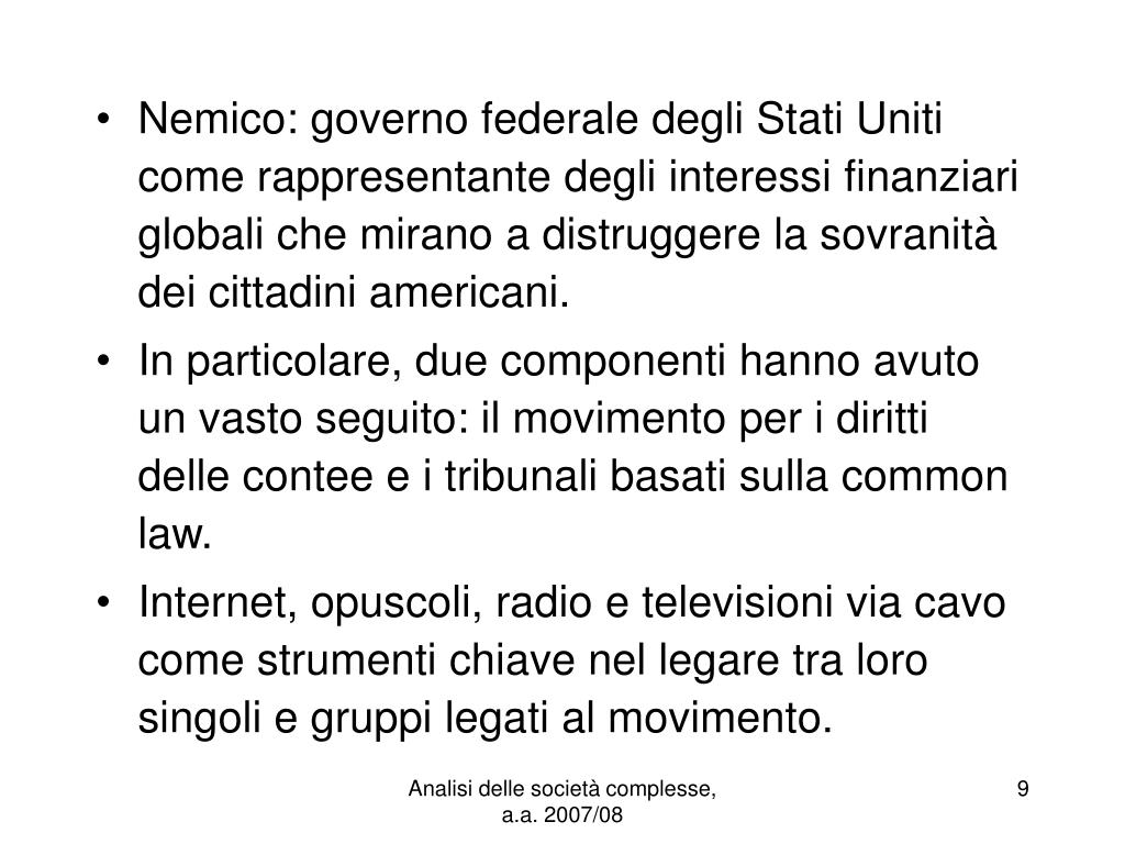 Nemico: governo federale degli Stati Uniti come rappresentante degli interessi finanziari globali che mirano a distruggere la sovranità dei cittadini americani. • In particolare, due componenti hanno avuto un vasto seguito: il movimento per i diritti delle contee e i tribunali basati sulla common law. • Internet, opuscoli, radio e televisioni via cavo come strumenti chiave nel legare tra loro singoli e gruppi legati al movimento. Analisi delle società complesse, a.a. 2007/08