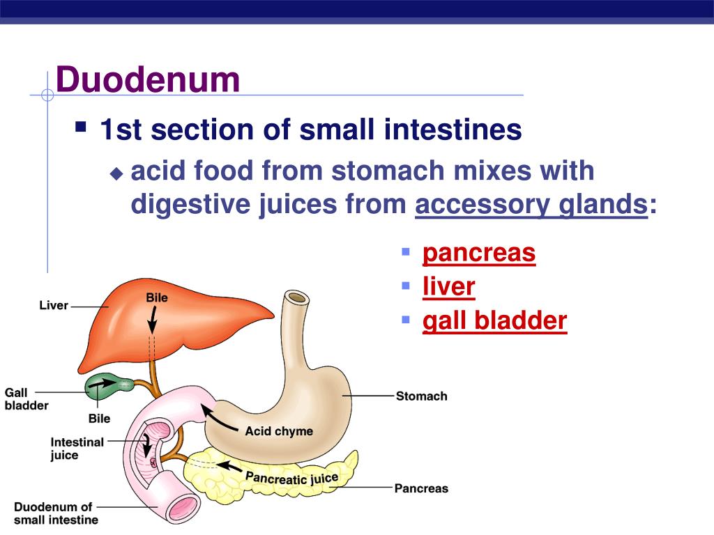 Duodenum • 1st section of small intestines • acid food from stomach mixes with digestive juices from accessory glands: • pancreas • liver • gall bladder