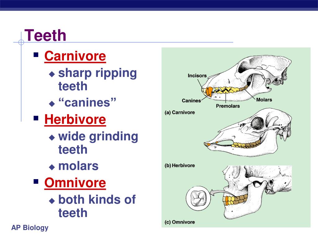 Teeth • Carnivore • sharp ripping teeth • “canines” • Herbivore • wide grinding teeth • molars • Omnivore • both kinds of teeth