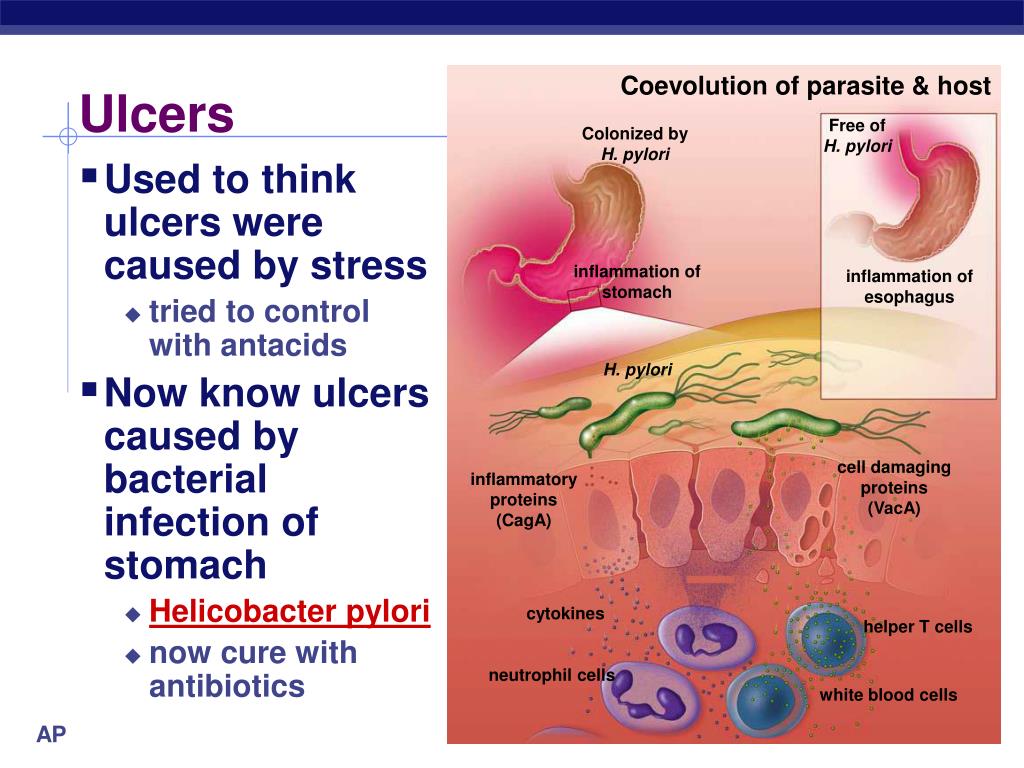 Coevolution of parasite & host Ulcers Free of H. pylori Colonized by H. pylori • Used to think ulcers were caused by stress • tried to control with antacids • Now know ulcers caused by bacterial infection of stomach • Helicobacter pylori • now cure with antibiotics inflammation of stomach inflammation of esophagus H. pylori cell damaging proteins (VacA) inflammatory proteins (CagA) cytokines helper T cells neutrophil cells white blood cells