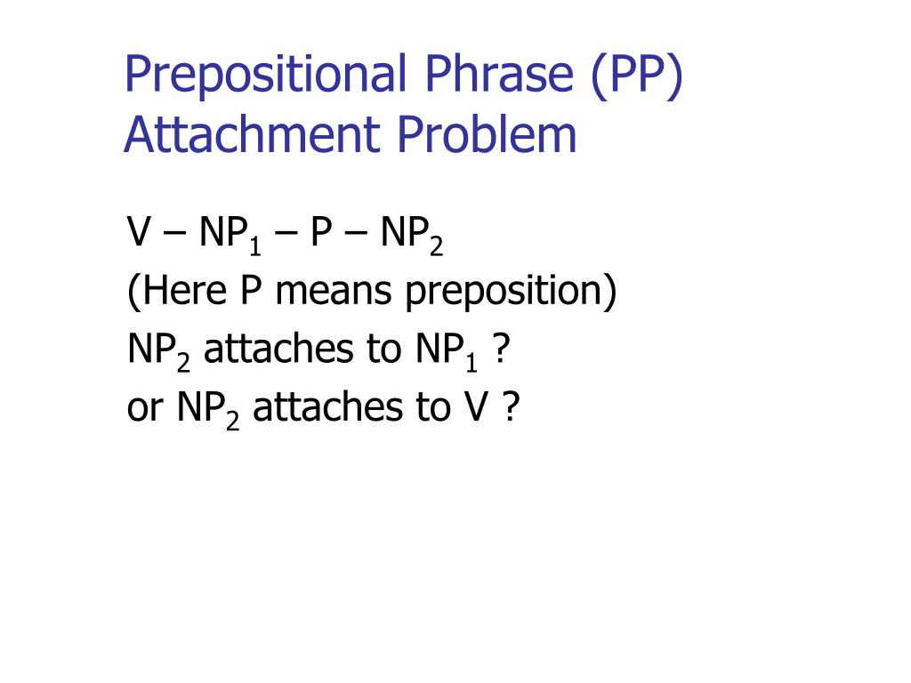 Prepositional Phrase (PP) Attachment Problem V – NP1 – P – NP2 (Here P means preposition) NP2 attaches to NP1 ? or NP2 attaches to V ?