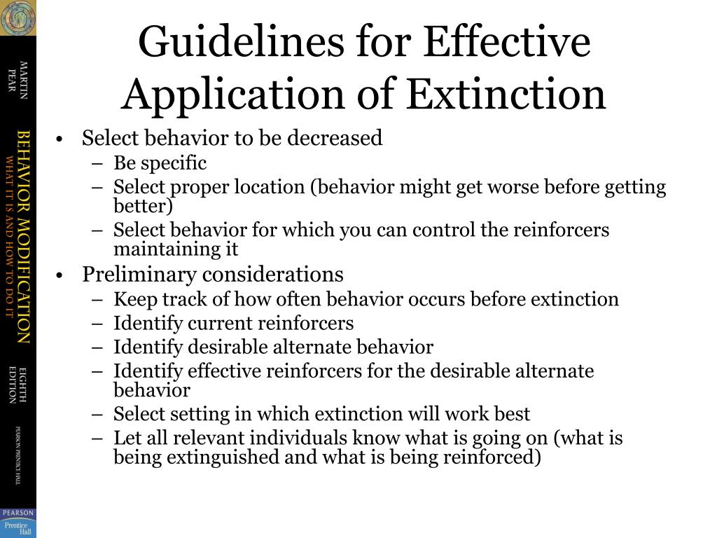 Guidelines for Effective Application of Extinction • Select behavior to be decreased • Be specific • Select proper location (behavior might get worse before getting better) • Select behavior for which you can control the reinforcers maintaining it • Preliminary considerations • Keep track of how often behavior occurs before extinction • Identify current reinforcers • Identify desirable alternate behavior • Identify effective reinforcers for the desirable alternate behavior • Select setting in which extinction will work best • Let all relevant individuals know what is going on (what is being extinguished and what is being reinforced)