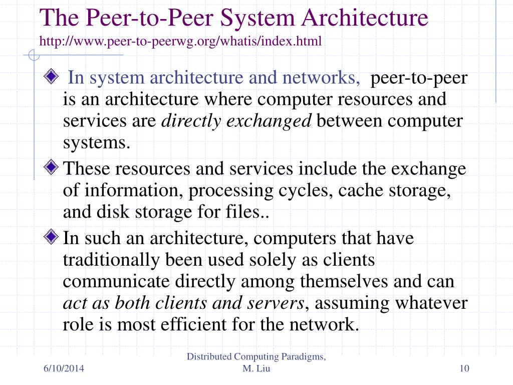 The Peer-to-Peer System Architecturehttp://www.peer-to-peerwg.org/whatis/index.html • In system architecture and networks, peer-to-peer is an architecture where computer resources and services are directly exchanged between computer systems. • These resources and services include the exchange of information, processing cycles, cache storage, and disk storage for files.. • In such an architecture, computers that have traditionally been used solely as clients communicate directly among themselves and can act as both clients and servers, assuming whatever role is most efficient for the network. Distributed Computing Paradigms, M. Liu