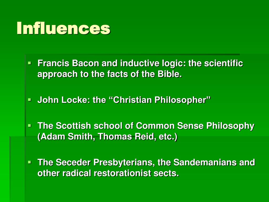 Influences • Francis Bacon and inductive logic: the scientific approach to the facts of the Bible. • John Locke: the “Christian Philosopher” • The Scottish school of Common Sense Philosophy (Adam Smith, Thomas Reid, etc.) • The Seceder Presbyterians, the Sandemanians and other radical restorationist sects.