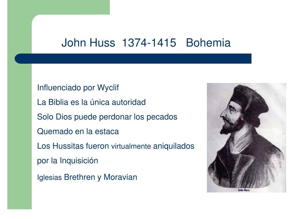 John Huss 1374-1415 Bohemia Influenciado por Wyclif La Biblia es la única autoridad Solo Dios puede perdonar los pecados Quemado en la estaca Los Hussitas fueron virtualmente aniquilados por la Inquisición Iglesias Brethren y Moravian