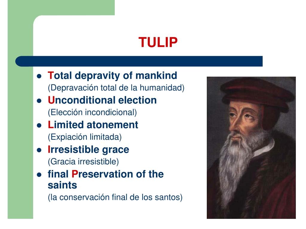 TULIP • Total depravity of mankind (Depravación total de la humanidad) • Unconditional election (Elección incondicional) • Limited atonement (Expiación limitada) • Irresistible grace (Gracia irresistible) • final Preservation of the saints (la conservación final de los santos)