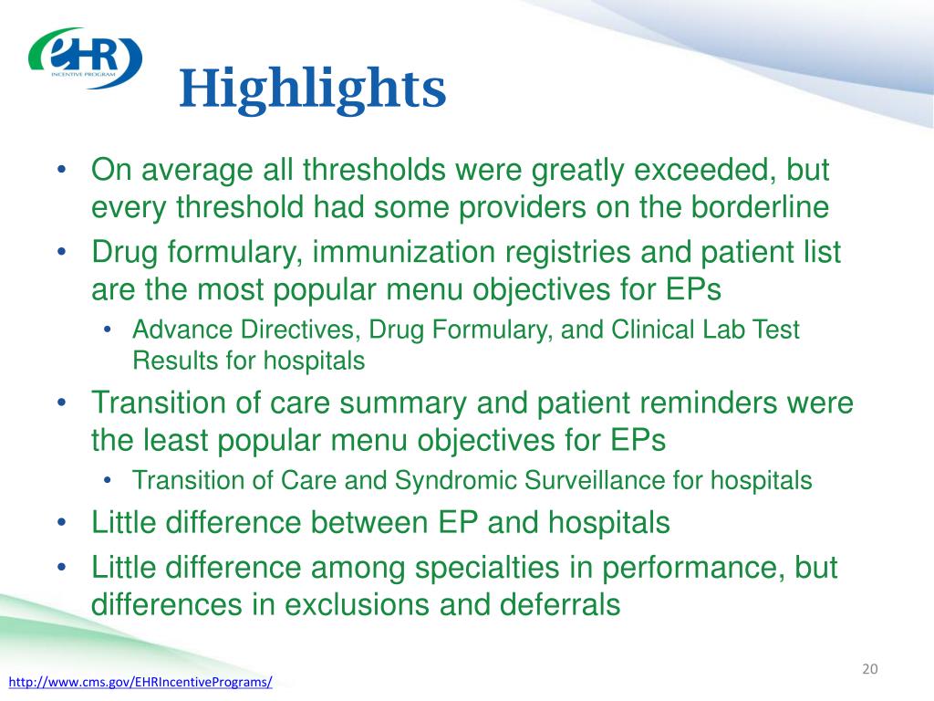 Highlights • On average all thresholds were greatly exceeded, but every threshold had some providers on the borderline • Drug formulary, immunization registries and patient list are the most popular menu objectives for EPs • Advance Directives, Drug Formulary, and Clinical Lab Test Results for hospitals • Transition of care summary and patient reminders were the least popular menu objectives for EPs • Transition of Care and Syndromic Surveillance for hospitals • Little difference between EP and hospitals • Little difference among specialties in performance, but differences in exclusions and deferrals